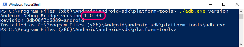在我的例子中,太新的版本是1.0.40。我找到了一个有1.0.39的文件夹。我重命名了platform-tools文件夹,这个文件夹对platform-toolsTooNew.来说太新了然后,我将包含platform-tools,v1.0.39的文件夹重命名为adb.exe,然后重新启动Visual。