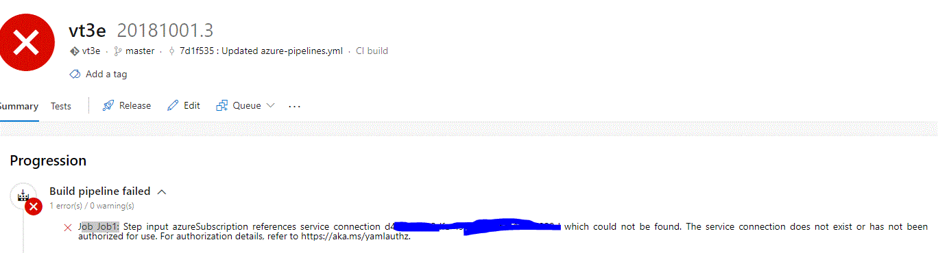 The service connection does not exist or has not been authorized for use. For authorization details, refer to https://aka.ms/yamlauthz.