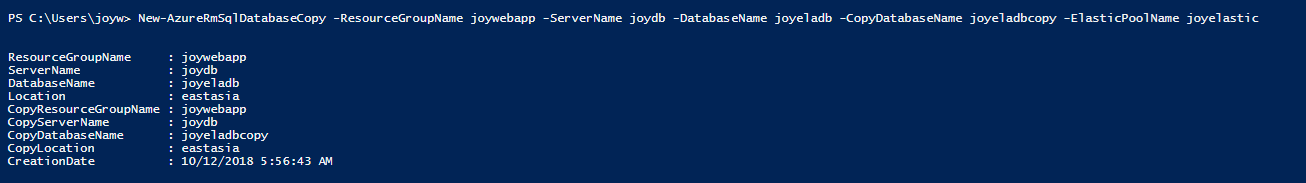 我认为New-AzureRmSqlDatabaseCopy运行得很好,如果您想要在弹性池中复制数据库,那么数据库及其副本应该在同一个server中。