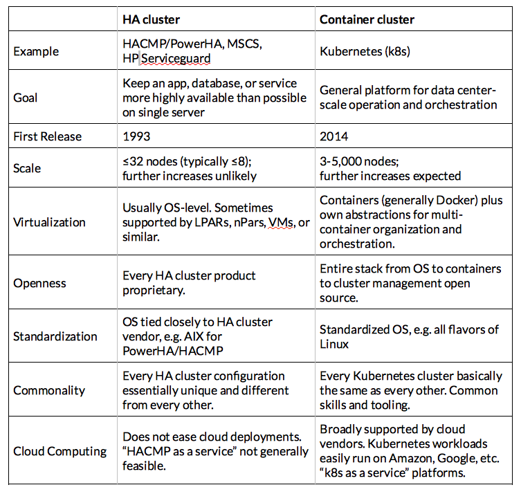 Kubernetes集群有一些高可用性的特性,但是从一个非常不同的世界观开始--20年后的今天,HACMP和朋友们开始了。在IT领域,20年=几代人。Kubernetes和类似的集群(例如Docker群)期望每个服务器托管多个“容器”(打包工作负载),而不是一个应用程序/工作负载。操作系统容器是一种轻量级的应用程序/系统/服务虚拟化形式,比主流应用程序在大多数HA集群的生命周期中根本不存在。