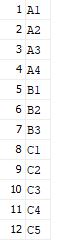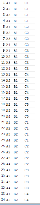然后查询。此时,预计将有60行记录,因为在“A”、“B”、“C”组中有4*3*5条记录。
