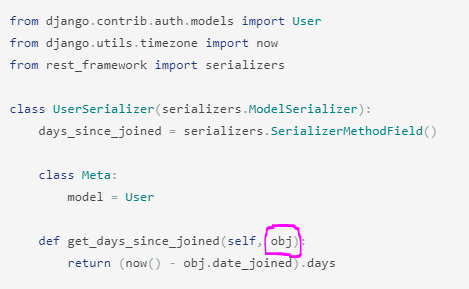 通常,source参数只是"*","*"指示序列化程序将实例传递给方法。如果您将source="date_joined"设置在您的SerializerMethodField上,那么您的get_days_since_joined可能会如下所示: