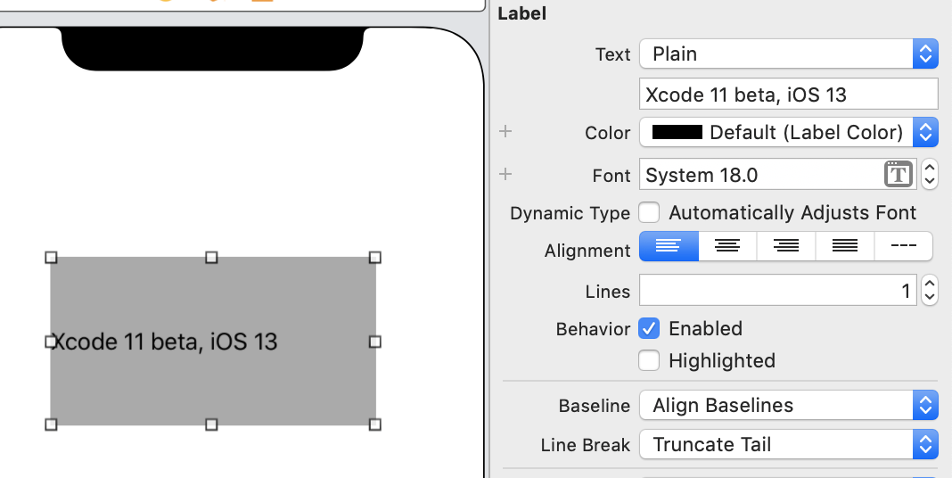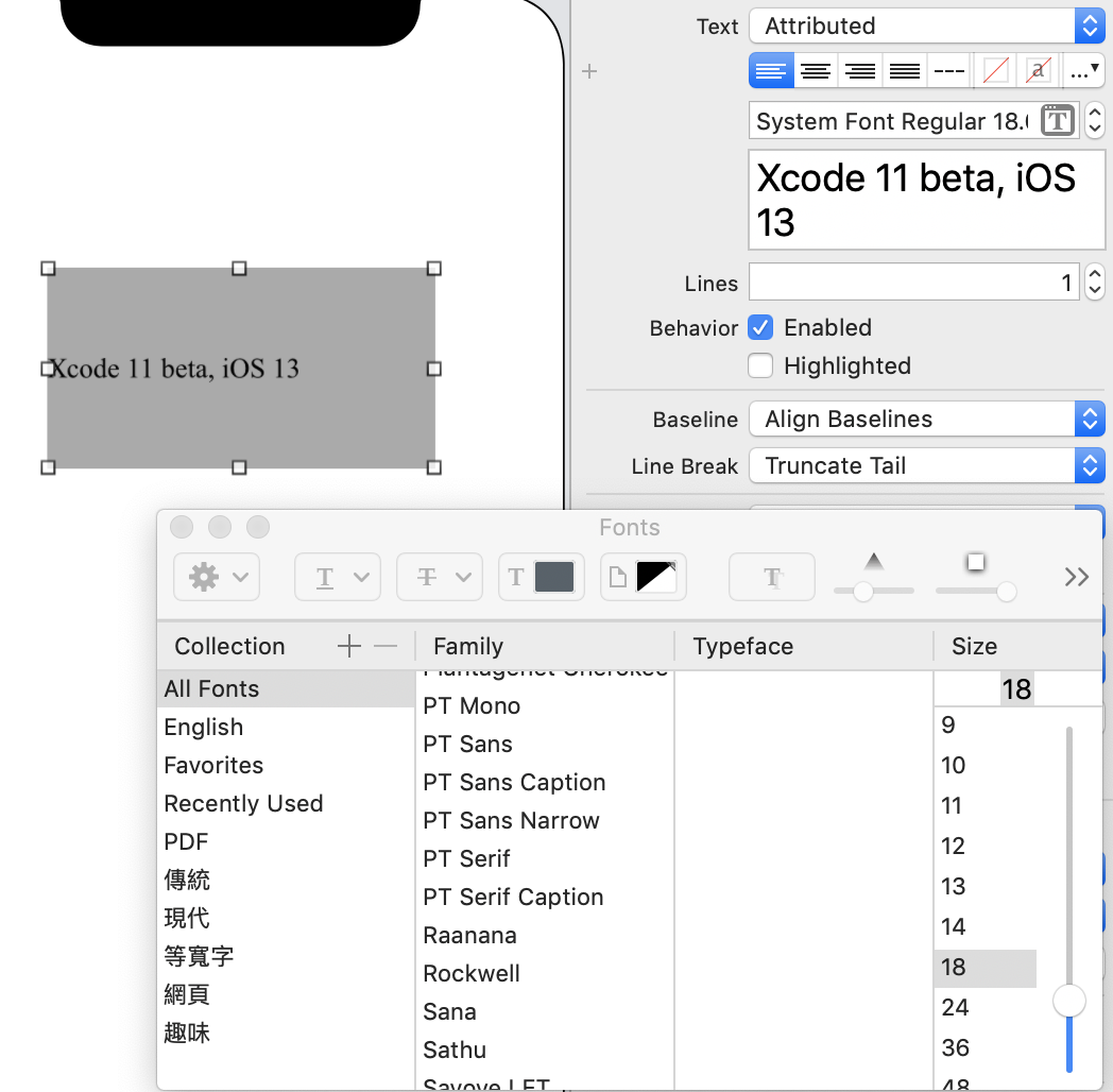 Xcode 11 Beta中创建一个新的或打开的现有项目。UILabel文本创建Plain,并保持系统字体的常规样式。
