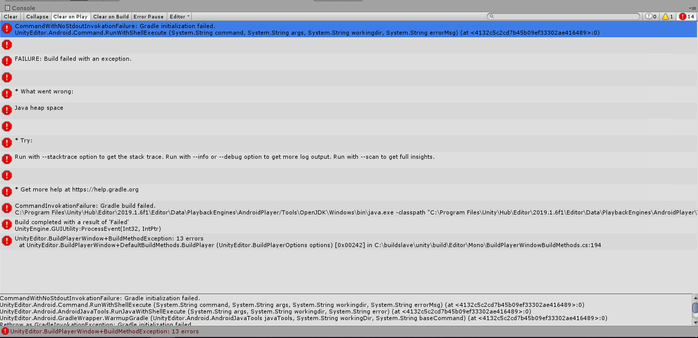 CommandWithNoStdoutInvokationFailure: Gradle初始化失败。UnityEditor.Android.Command.RunWithShellExecute (System.String命令,System.String args,System.String workingdir,System.String errorMsg) (at <4132c5c2cd7b45b09ef33302ae416489>:0) UnityEditor.Android.AndroidJavaTools.RunJavaWithShellExecute (System.String args,System.String workingdir,System.String error) (at <4132c5c2cd7b45b09ef33302ae416489>:0)