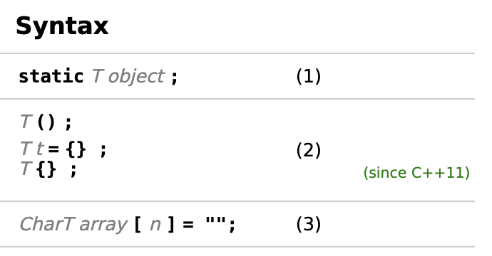 具有静态存储持续时间的变量首先在编译时为零初始化,然后在运行时可选地动态初始化。static T object;声明一个静态存储持续时间的对象。对于一个简单的声明,如