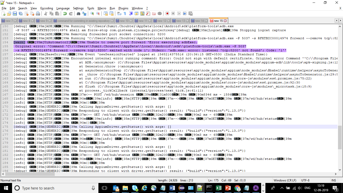 Unable to remove port forward 'Error executing adbExec. Original error: 'Command 'C\:\\Users\\Sumit.Chouhtel\\AppData\\Local\\Android\\sdk\\platform-tools\\adb.exe -P 5037 -s RFXTBIC00014974 forward --remove tcp\:8200' exited with code 1'; Stderr: 'adb.exe: error: listener 'tcp:8200' not found'; Code: '1''