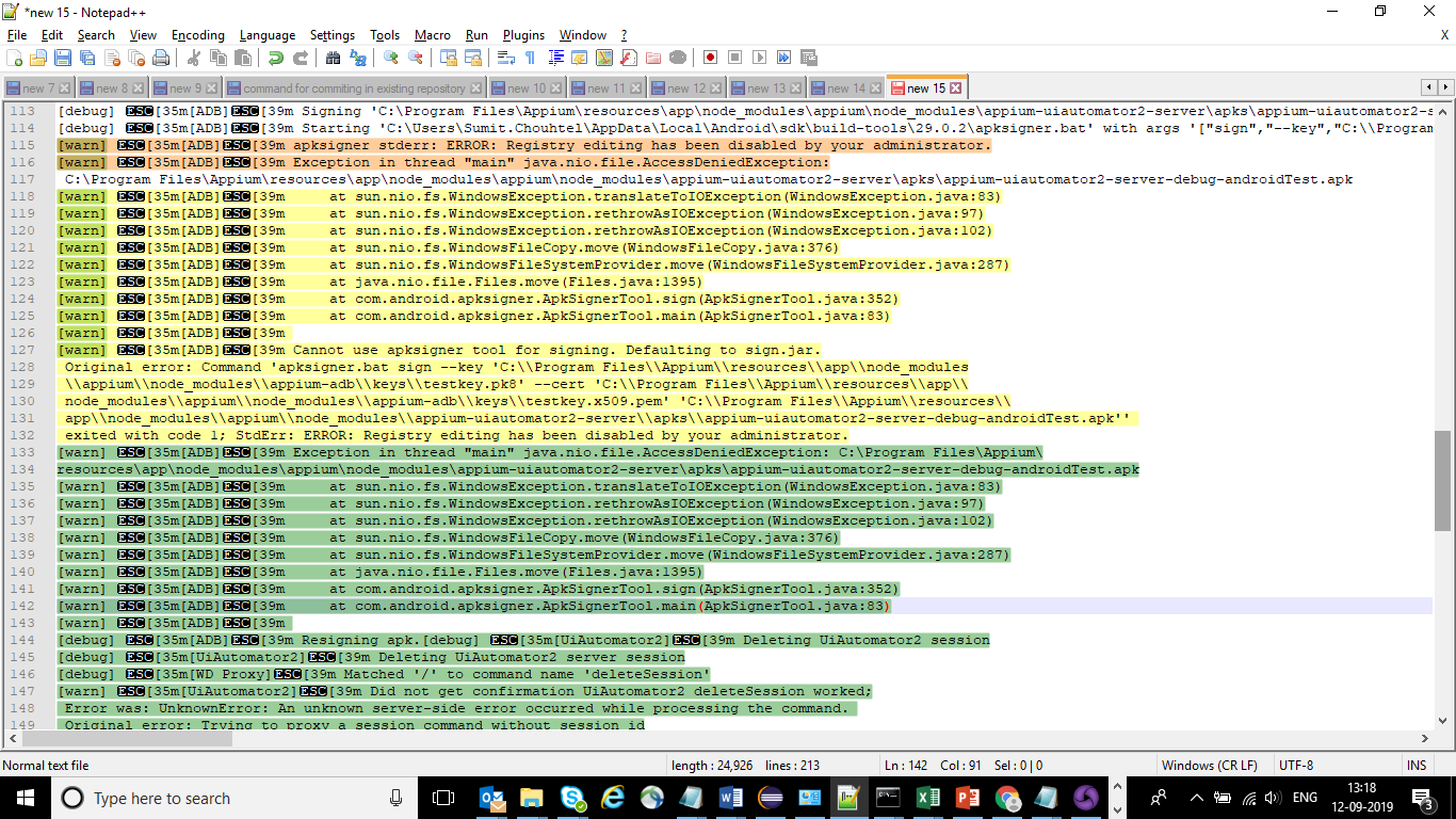 Cannot use apksigner tool for signing. Defaulting to sign.jar. Original error: Command 'apksigner.bat sign --key 'C:\\Program Files\\Appium\\resources\\app\\node_modules\\appium\\node_modules\\appium-adb\\keys\\testkey.pk8' --cert 'C:\\Program Files\\Appium\\resources\\app\\node_modules\\appium\\node_modules\\appium-adb\\keys\\testkey.x509.pem' 'C:\\Program Files\\Appium\\resources\\app\\node_modules\\appium\\node_modules\\appium-uiautomator2-server\\apks\\appium-uiautomator2-server-debug-androidTest.apk'' exited with code 1; StdErr: ERROR: Registry editing has been disabled by your administrator.