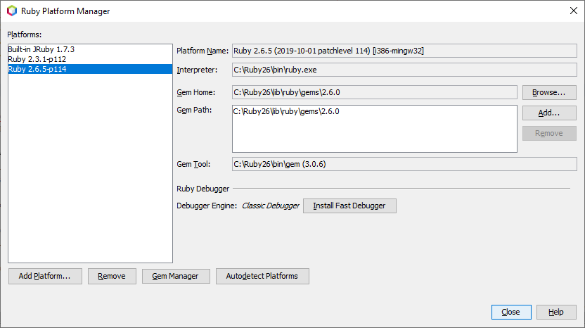 我在Windows上使用Netbeans已经有几年了,甚至在它成为之前。我仍然很高兴在ApacheNetBeansIDE11.0中使用Ruby2.4 + MSYS2和Ruby2.4(NetBeans8.2插件门户可以顺利地在Netbeans 11.0IDE中使用),它帮助我很好地调试Ruby代码,并安装了快速调试器( Ruby - debug -ide gem)。但是,由于一些限制,我必须转到Ruby2.6.3。因此,我安装了我在Ruby2.4到Ruby2.6环境中看到的所有宝石,并希望它能够工作。