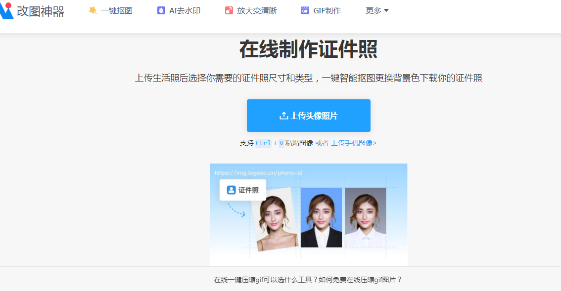 改图神器地在线制作证件照工具可以免费上传照片制作自己需要的证件照,一键ai抠图,支持裁剪各类常用尺寸。