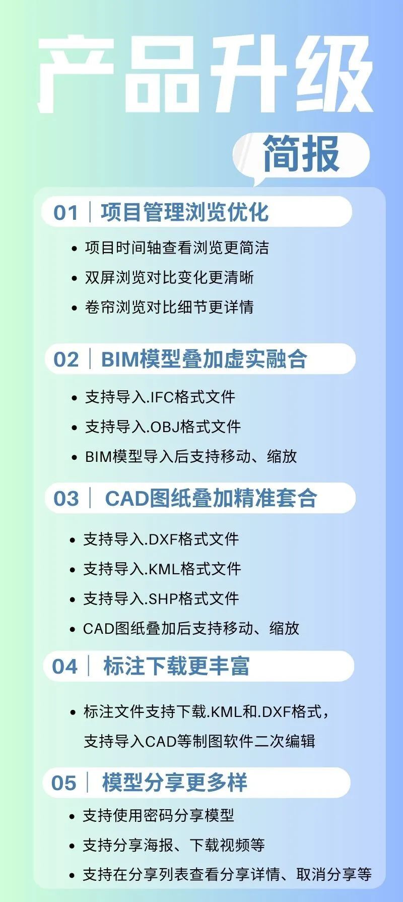 经过优化升级,模型分享时,支持设置分享密码,可使模型数据更安全。更可一键分享海报、生成视频等,让模型分享更丰富多样。已经分享的模型可查看分享明细、取消分享。