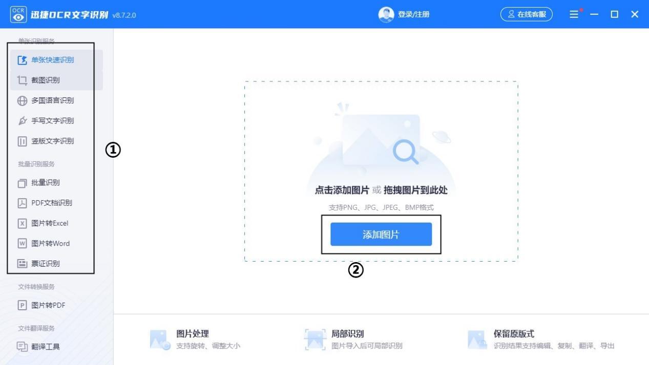 首先我们打开这款工具,进入后我们可以在左侧看到各种识别功能,包括单张、多张图片识别、其他国家语言识别、手写文字识别、竖版文字识别等,选择需要的功能,接着在右边可以看到添加图片按钮,点击该按钮讲需要识别的图片添加进来。