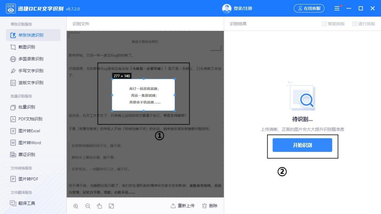 导入图片表格后,我们先根据识别需求选择是全页面识别还是部分区域识别,如果只需要识别部分区域就选中需要识别的区域,然后点击右侧的开始识别按钮即可。