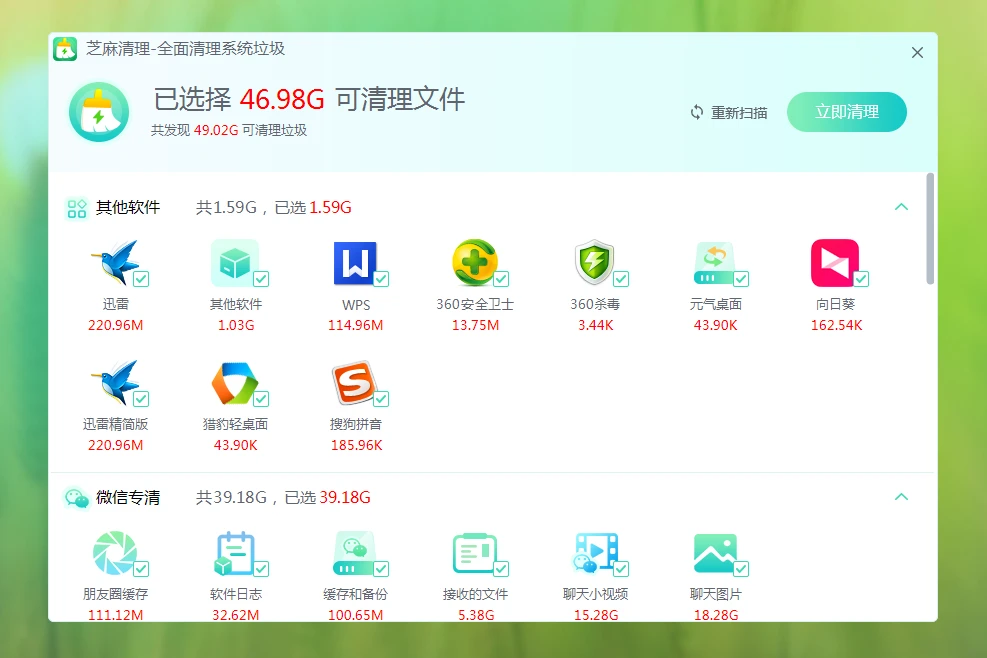 芝麻清理软件(下载地址:https://clean.zhimasoft.cn/?tqq)是一个专业的C盘清理工具,可以帮助许多不懂C盘清理的用户,彻底清理干净C盘垃圾,这个软件清理速度非常快,操作也简单,适合小白用户也适合资深互联网人。C盘清理其实是一个非常耗时,非常复杂的一个事情,并是不随随便便就可以清理干净C盘的,专业的事情还是要有专业的工具辅助才行。