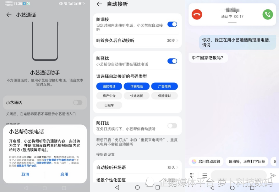 另外,华为手机的小艺通话可以帮助听障人士极大降低接听电话的难度。长按华为手机电源键唤醒小艺、说出“打开小艺通话”,开启相关功能开关。只要提前设置完成后,在接听电话时就能切换至小艺通话,实现实时的语音和文本互转,让不方便说话、有听力障碍的人能知道对方在说什么,也能让对方知道听障人士想要表达什么,非常方便。