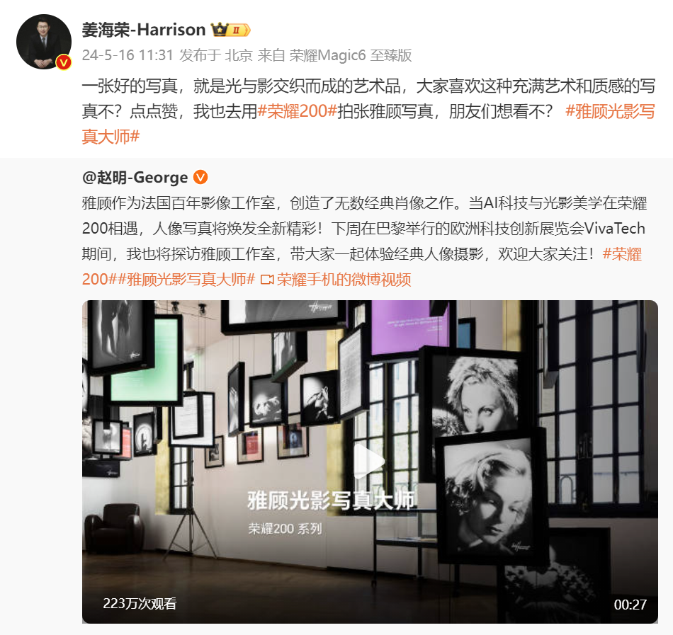 5月16日,荣耀官方宣布——荣耀与法国雅顾摄影工作室将开展深度的影像技术合作,共同开拓移动人像新赛道。