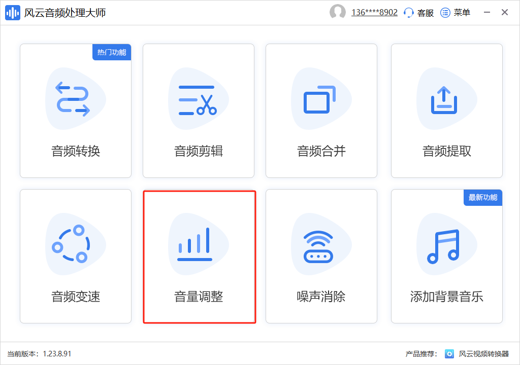 我们先来选择风云音频处理大师软件,打开软件之后再首页当中找到音量调整的选项,点击进入功能页。