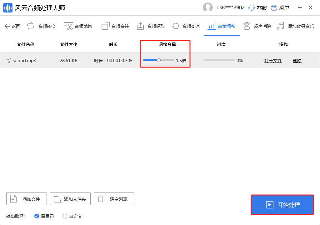 用户在风云音频处理大师软件里来通过调整音量下的拉条往右增加倍率,这样就可以将音量增大。