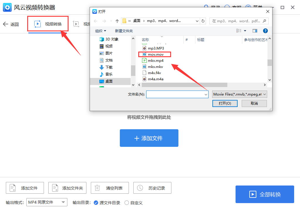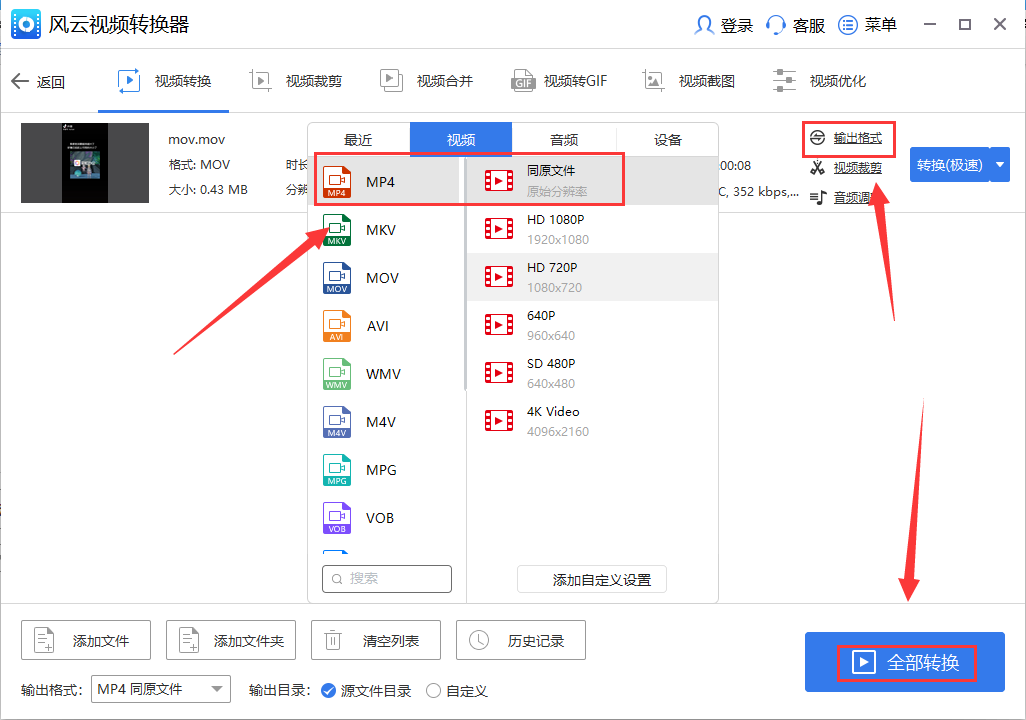 2、在【输出格式】里选择【mp4】格式后点击右下角的【全部转换】。