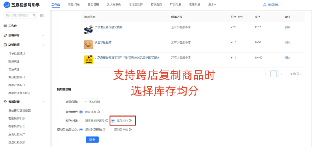 在进行跨店复制时,如果商家选择了库存均分选项,系统会自动将商品的总库存平均分配到所选的每个店铺。如果库存数量无法被整除,剩余的库存将退回到原店铺。
