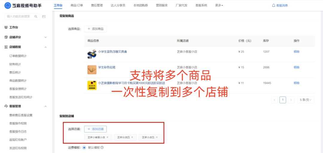 通过芝麻视频号助手,商家可以一次性将一个店铺的商品复制到其他多个店铺。例如,在选择要复制的商品后,商家可以选择多个目标店铺,如B店铺和C店铺,然后点击复制按钮即可完成操作,无需重复进行。
