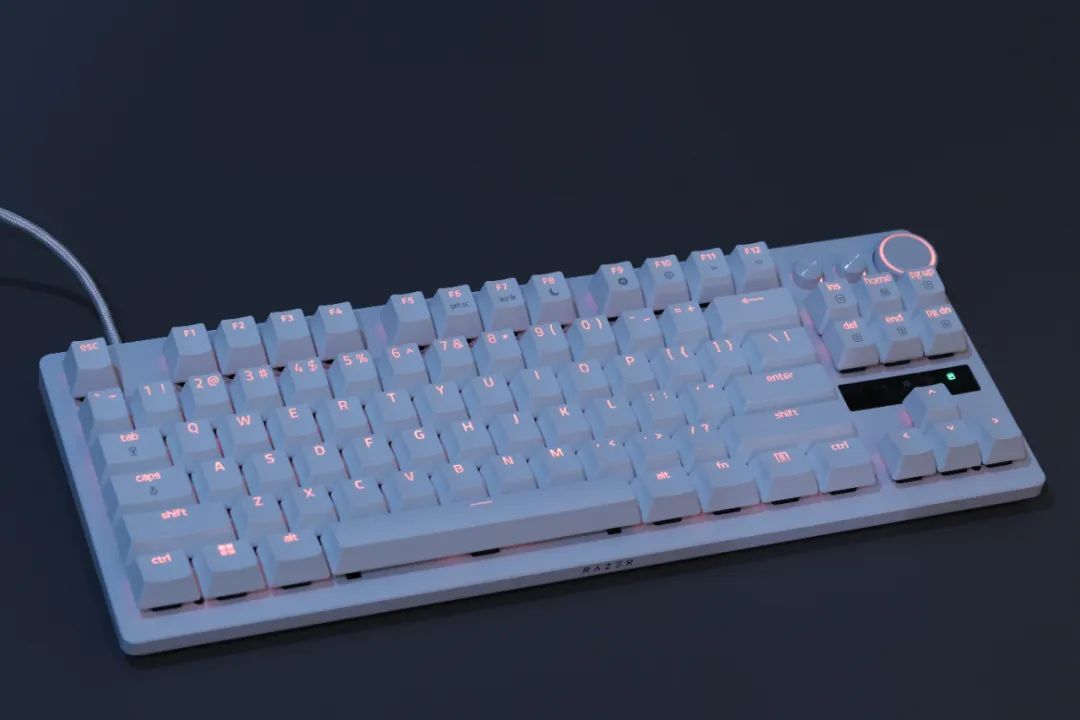 雷蛇猎魂光蛛V3专业竞技版机械键盘的整体风格相对简雅——它采用窄边框和悬浮式的按键设计,363mm×139mm的长宽比搭配只有0.919kg的重量,因而可以嵌入相对小巧的桌面环境,或者方便玩家装包携带。同时,键盘上盖选用了质感突出的铝合金材料,搭配整体的白色调看起来颇为素雅。由于键盘右上角加入了多功能旋钮和2个专用控制按键,因此这款机械键盘不仅具备不错的科技感,同时也便于玩家在日常使用时控制多媒体和调整音量。