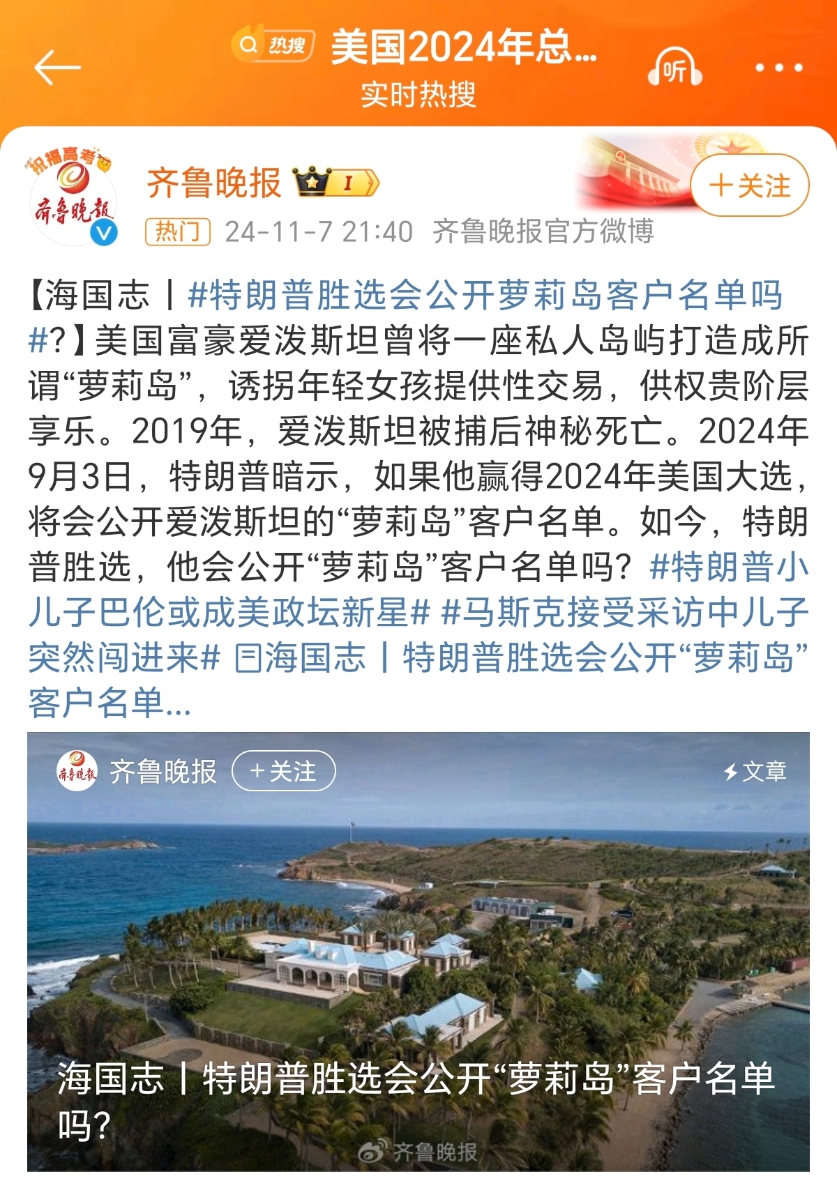 特朗普胜选会公开萝莉岛客户名单吗?无数富豪争先恐后的登上萝莉岛,难道只是单纯的为了生理需求?