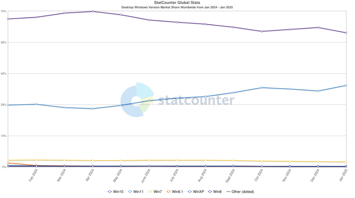 根据 StatCounter 的说法,Windows 10 目前占所有 Windows 设备的 60.33%。2025 年 1 月,其份额环比下降了 2.37%,同比下降了 6.14%(IT之家注:2024 年 1 月,Windows 10 的份额为 66.47%)。