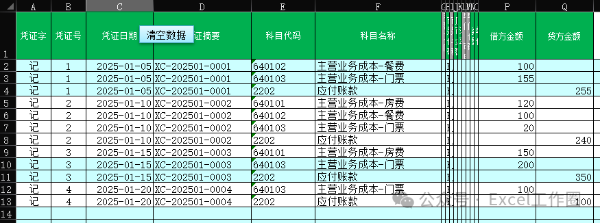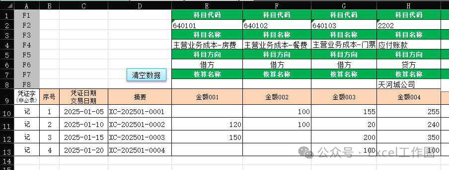 例如下图,列数固定,有金额的对应生成分录科目一样的,只是金额不同。
