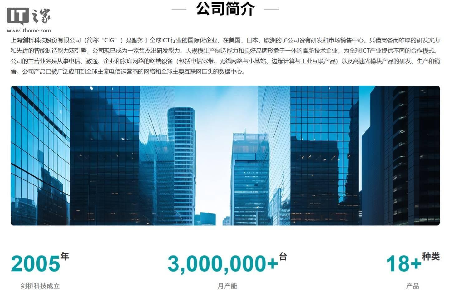 成立于2005年的上海剑桥科技股份有限公司(CIG),在全球范围内拥有广泛的业务布局,其在美国、日本及欧洲的子公司均设立了研发和市场销售中心。公司主营业务涵盖电信、数通、企业和家庭网络的终端设备研发、生产和销售,包括电信宽带设备、无线网络与小基站、边缘计算与工业互联产品,以及高速光模块产品。