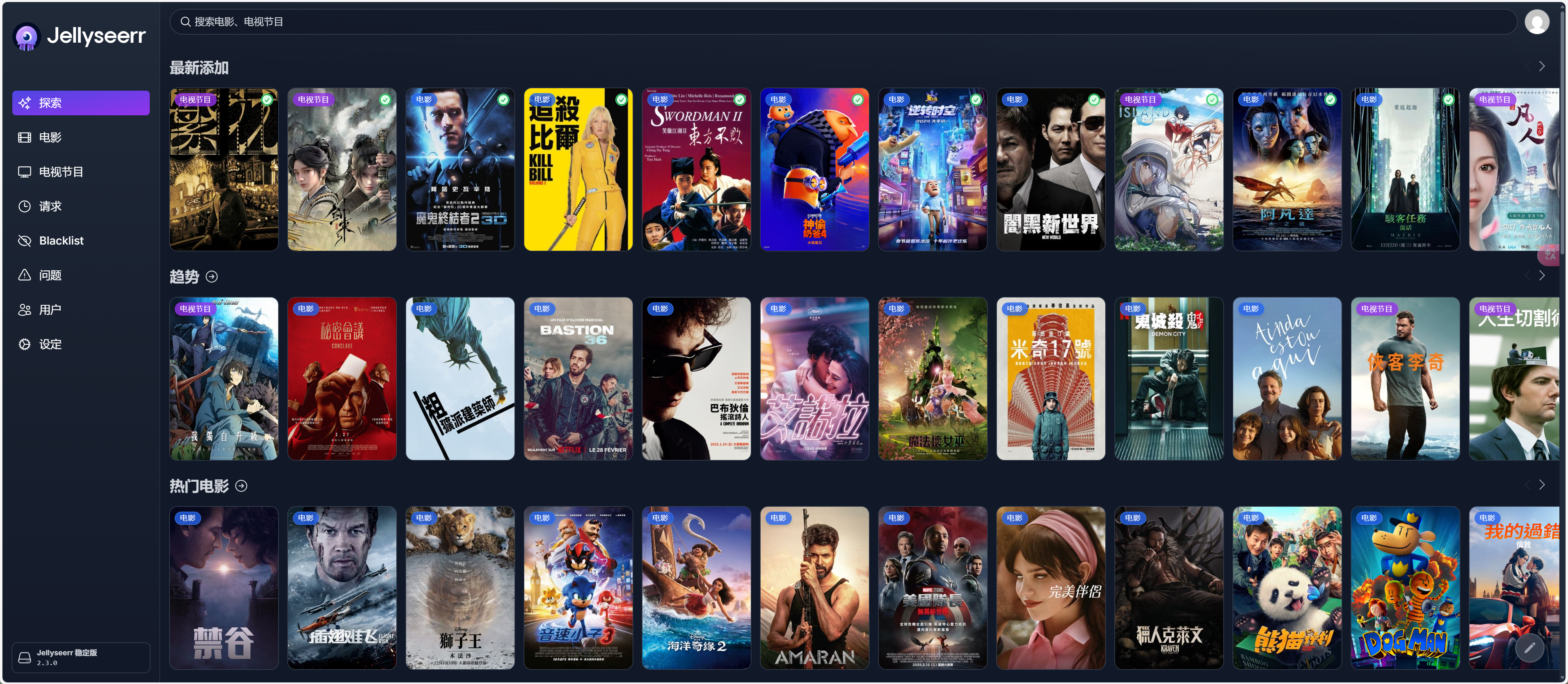 来到JellySeerr首页可以看到这里已经展示的是各类影视资源的海报墙,界面还是挺漂亮的。最上面的“最新添加”就是同步过来的Jellyfin服务器上的资源,下面还有JellySeerr系统推荐的热门影视等。