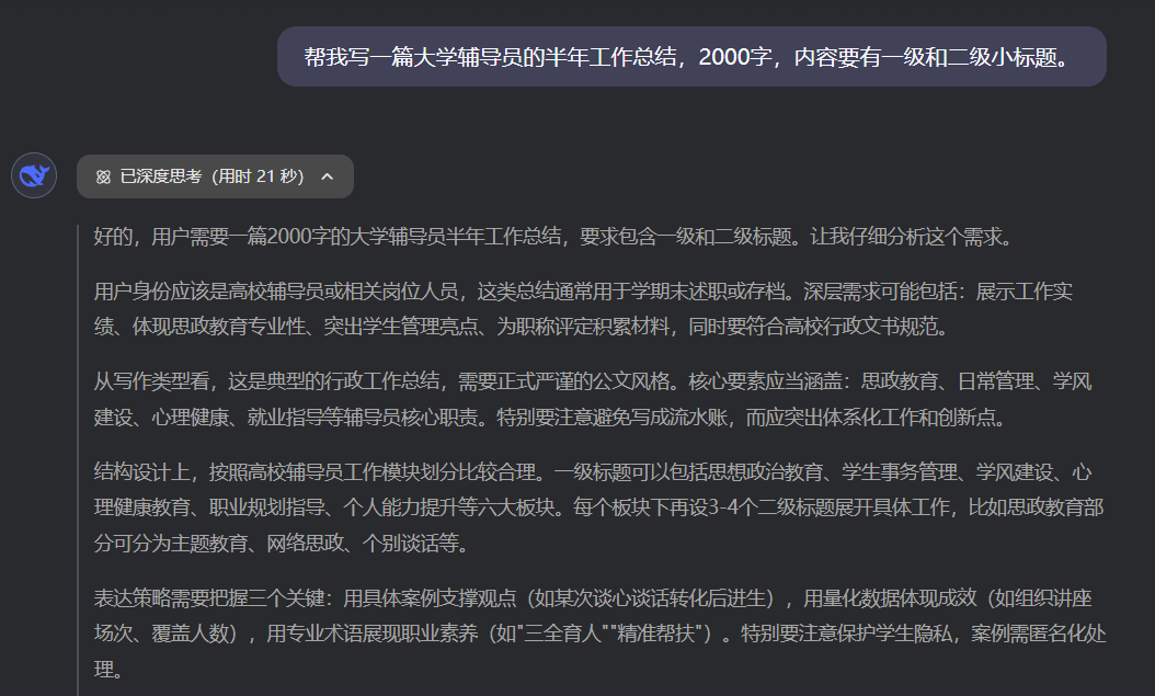 我随便举个例子,比如:帮我写一篇大学辅导员的半年工作总结,2000字,内容要有一级和二级小标题。