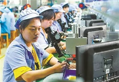 图为工人们正在操作微点焊机装配电动牙刷中的微型电动机。