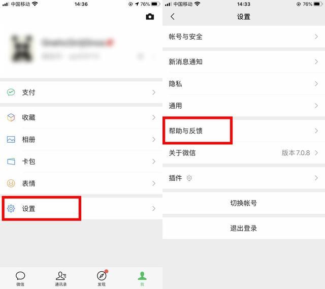 1. 打开手机微信,进入【我】界面,然后选择【设置】功能,在【设置】功能界面内,选择【帮助与反馈】;