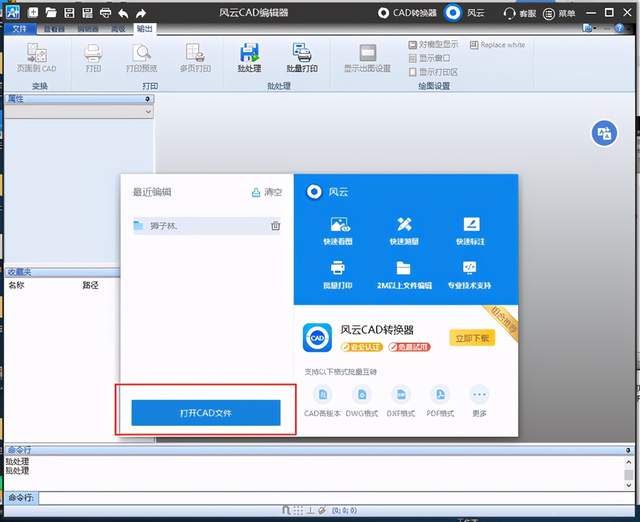 步骤一:启动风云CAD编辑器,CAD软件进入到操作窗口中,点 击上方左侧功能栏中的【文件】-【打开】按钮选项,界面会跳转到【打开】对话框中,在对话框中打开需要进行使用的CAD文件。