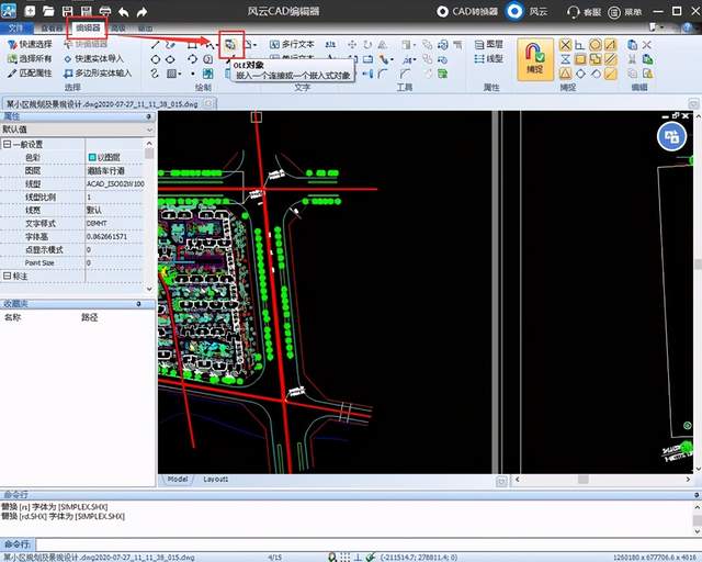 步骤二:CAD文件打开后,将中的功能栏切换到【编辑器】中,【绘制】栏中找到【OLE对象】进行点击(OLE是ObjectLinkingandEmbedding的缩写,就是嵌入一个链接或一个嵌入式对象)。