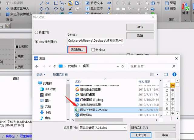 步骤四:然后在点击【插入对象】对话框中的【浏览】按钮,在弹出的浏览对话框中找到需要进行嵌入的文件进行打开(这里以嵌入一个Excel表格为例)。