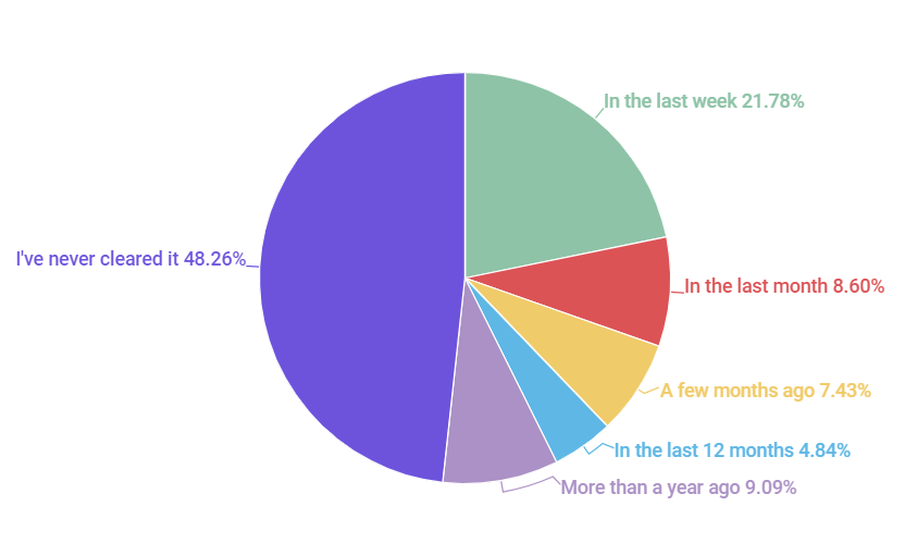为此,国外媒体Android Authority做了一个关于“你上次清理手机缓存是什么时候?“,该调查收获了6100张投票,结果如上图所示。其中,有将近一半(48.26%)的人表示从未清理手机缓存,有趣的是占比第二(21.78%)的是在上周清理过手机缓存,这意味着这部分人可能有着主动清理手机缓存的习惯。而剩下的则在一个月前、几个月前甚至超过一年清理过手机缓存。