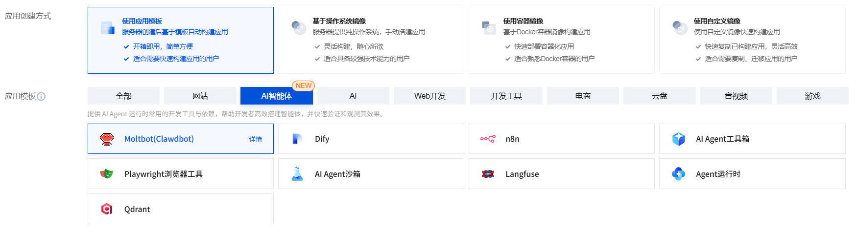 应用创建方式:选择使用应用模板 > AI 智能体 > Moltbot(Clawbot),其他参数可参见 购买方式 进行配置。