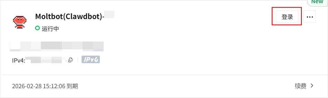 4. 返回轻量应用服务器控制台,待实例创建完成后,单击实例卡片 > 登录,开始 Moltbot 应用的各项配置。详细登录操作请参见 使用 OrcaTerm 登录 Linux 实例(推荐)。