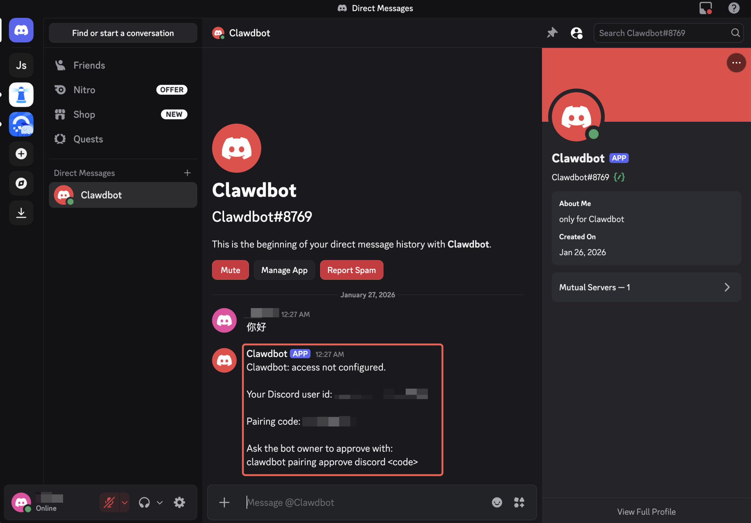 7. 启动成功后,返回 Discord,与 bot 进行私聊获取配对码。