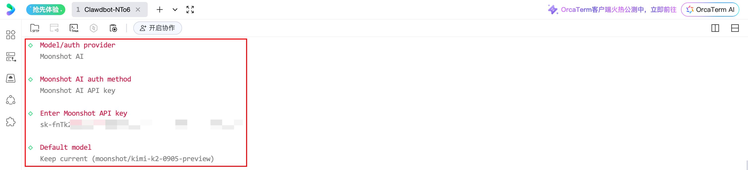 Moonshot AI auth method 选择 Moonshot AI API key,然后输入您的 Moonshot API Key。