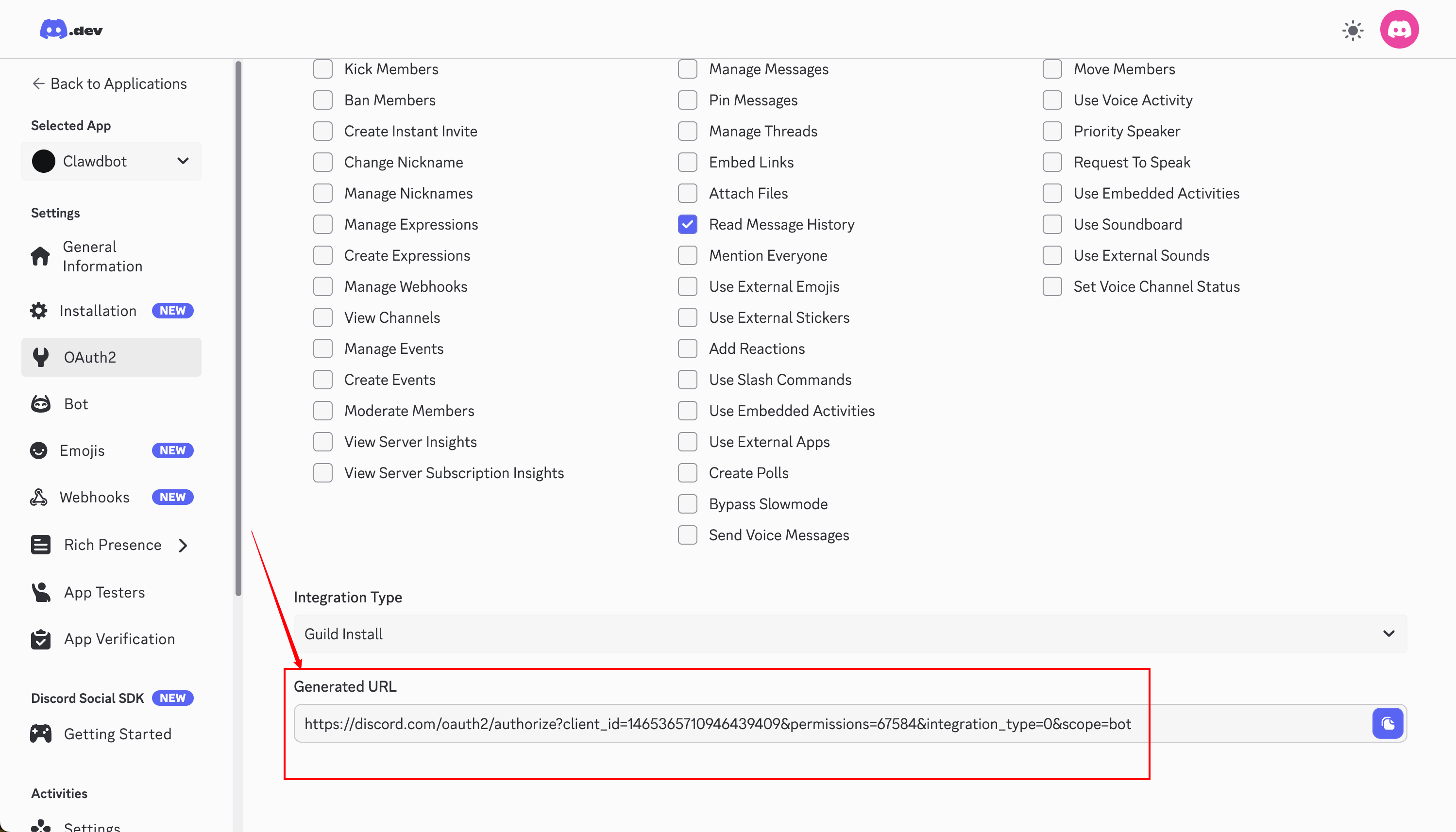 在 Bot Permissions 中勾选 Send Messages 和 Read Message History。