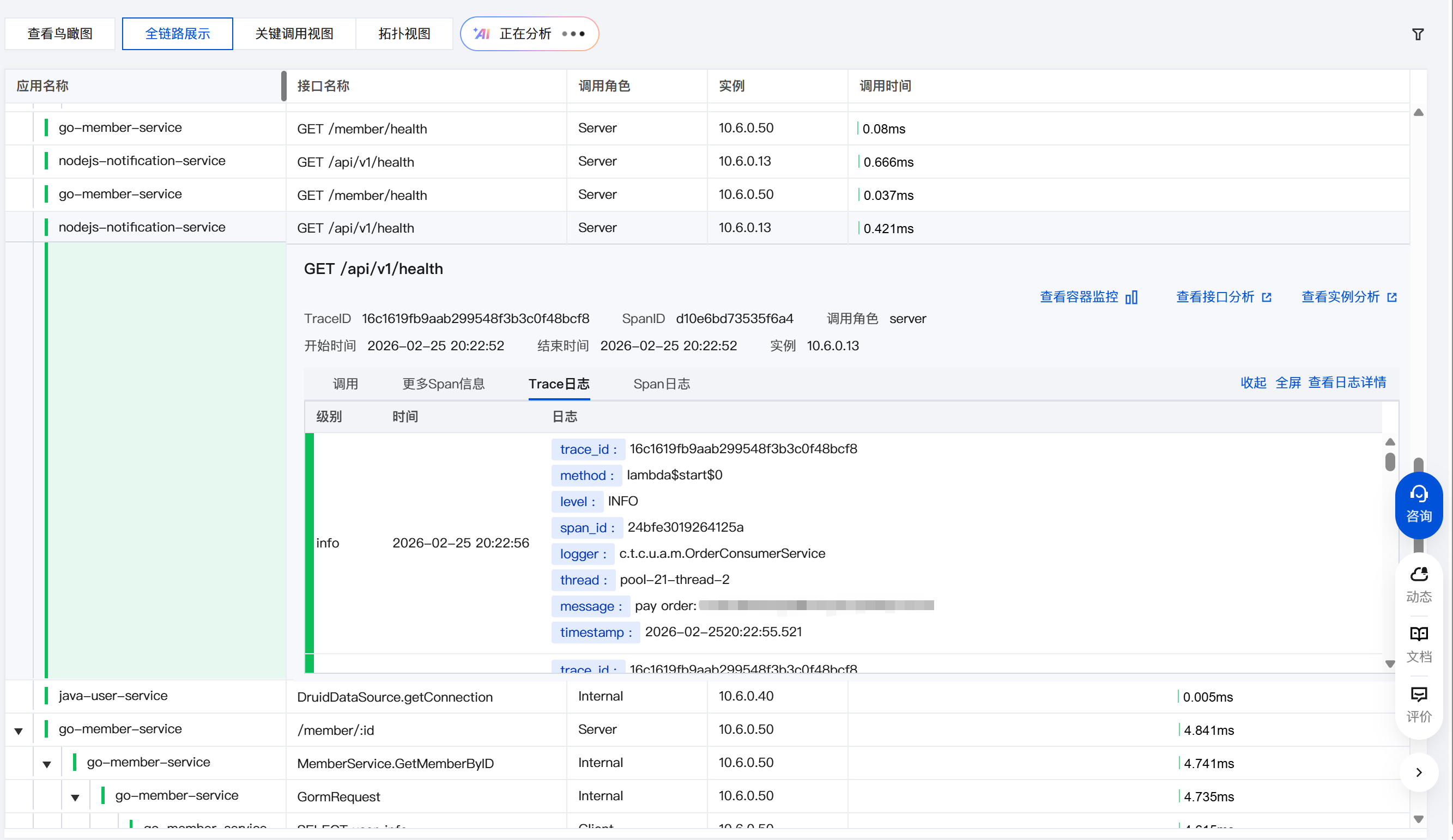 4. 在 Trace 日志和 Span 日志标签页中,可以查询该链路对应的日志信息。