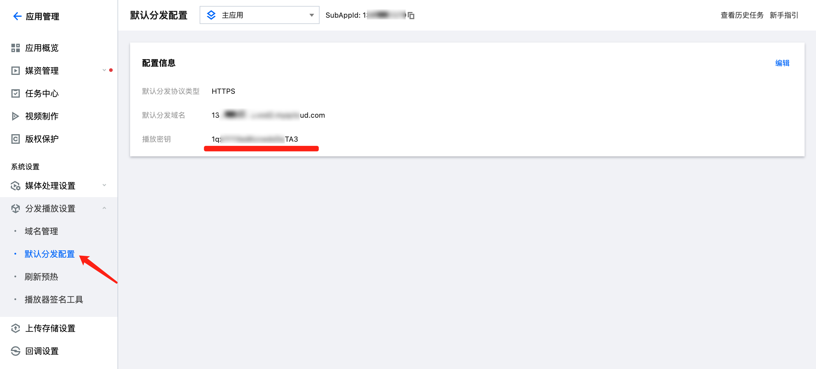 其中,播放密钥(pkey)可访问云点播控制台 > 选择当前使用的应用 > 分发播放设置 > 默认分发配置 > 播放密钥处获取。