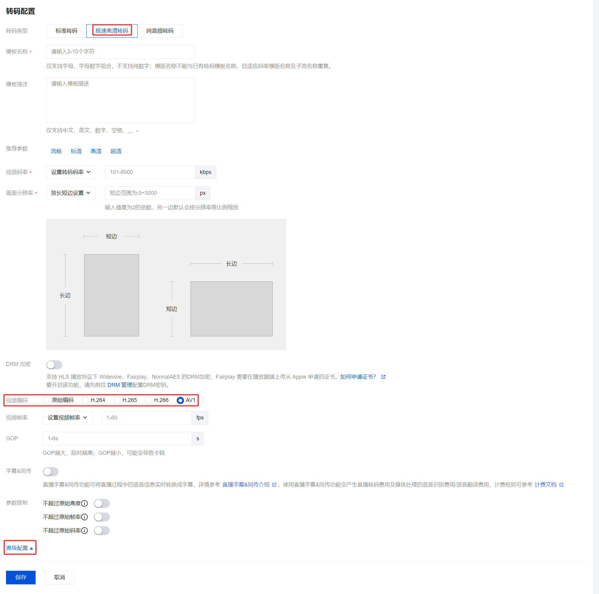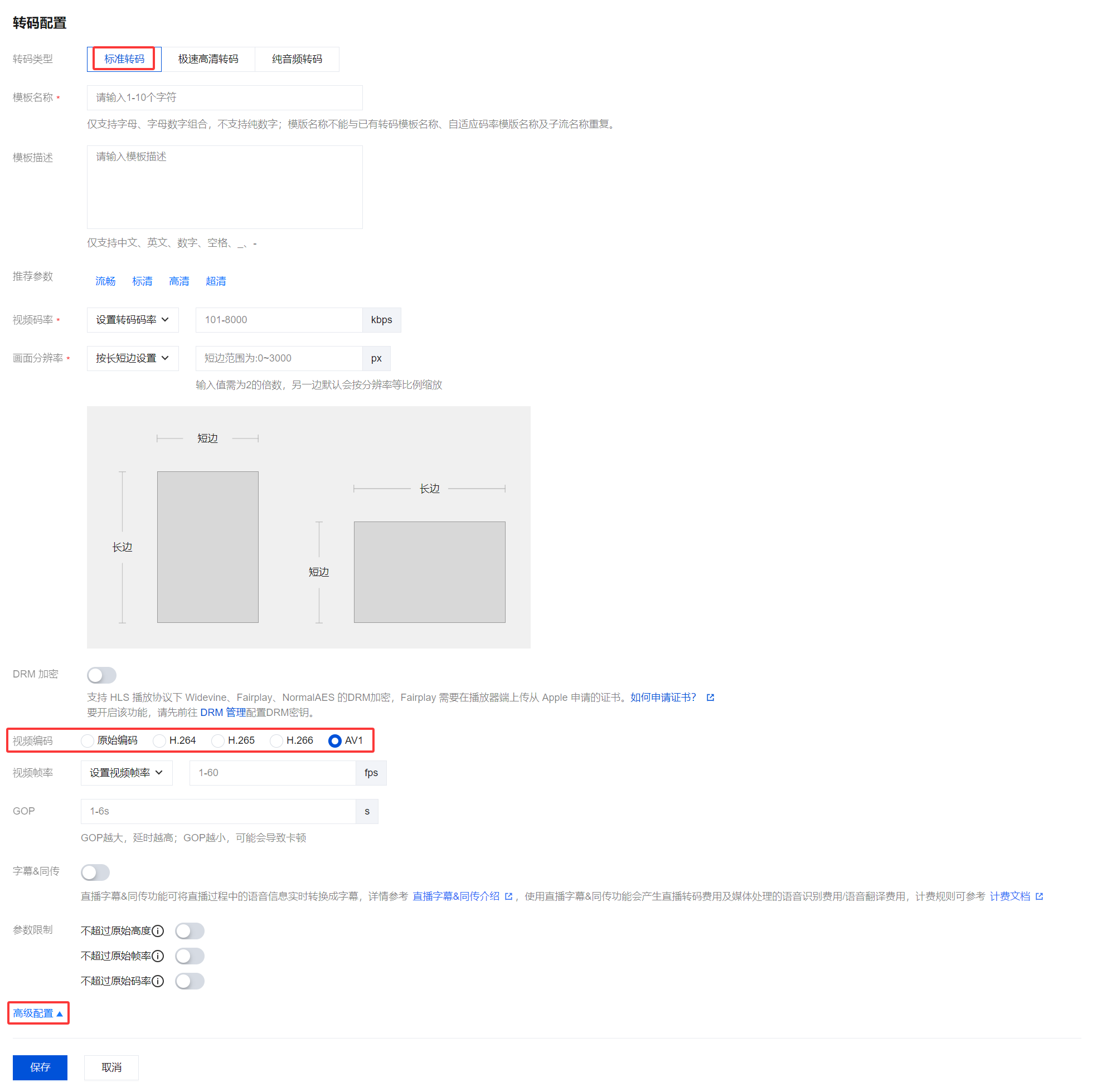 3. 选择转码类型为标准转码或极速高清转码,展开高级配置。在编码方式中选择 AV1。