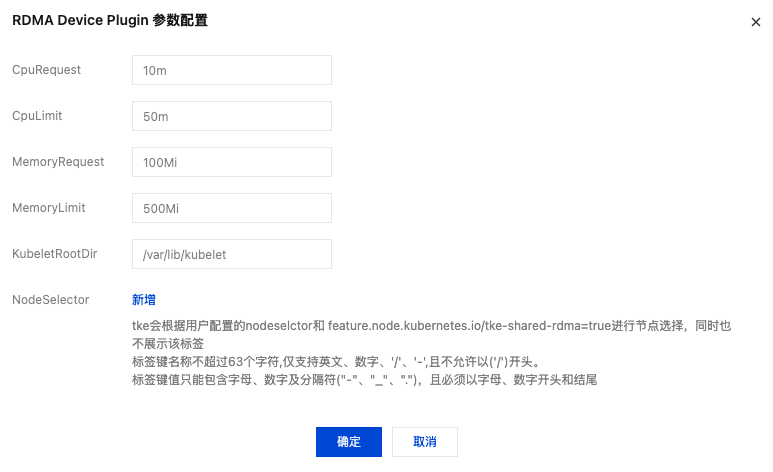 NodeSelector | 组件所需运行节点的 label 键值对,默认配置是 feature.node.kubernetes.io/tke-shared-rdma=true,若需自定义部署的节点 label,则需要修改这个配置。 |