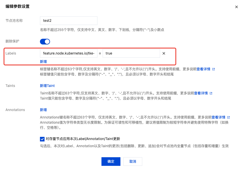 4. 添加、修改后,也可勾选“对存量节点应用本次 Label/Annotation/Taint 更新”,从而应用到存量节点。