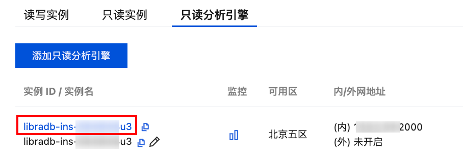 2. 在集群管理页,单击实例列表 > 只读分析引擎,然后单击目标只读分析引擎实例的实例 ID,进入实例详情页面。