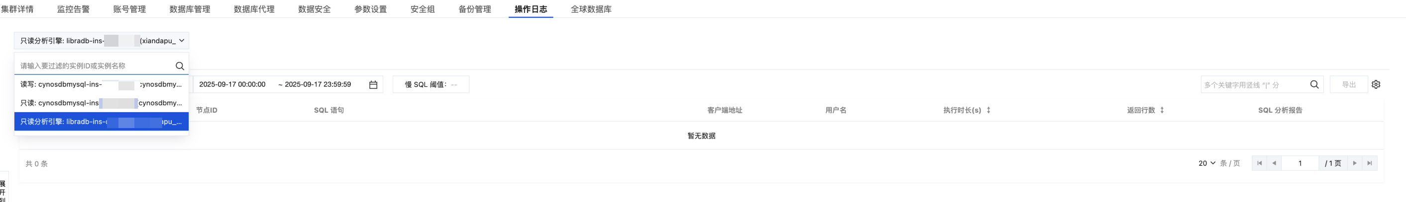 分析引擎的慢日志可进入到集群列表,找到需要查看慢 SQL 的集群。在集群详情页面点击操作日志,并在左上角实例下拉列表中,找到只读分析引擎。即可在列表中查看只读分析引擎的慢日志明细。