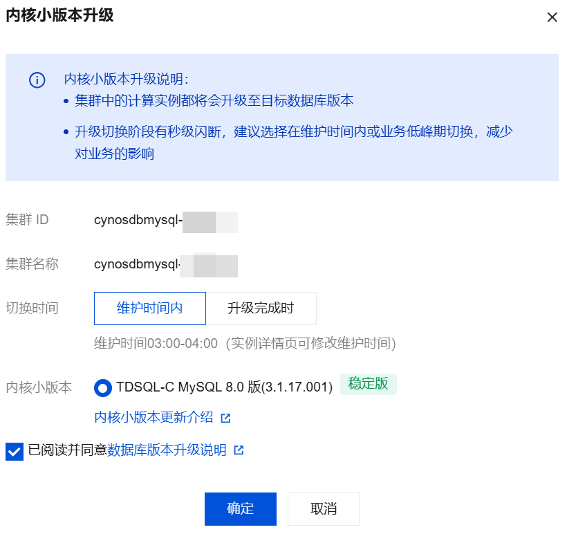 4. 在弹窗下选择切换时间和要升级的目标内核小版本,勾选“已阅读并同意数据库版本升级说明”,单击确定。